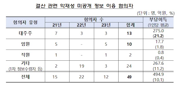 주된 혐의자는 대주주와 임원 등 내부자였다. 특히 대주주는 미공개 정보를 이용해 막대한 손실을 회피했다. 혐의자 49명 중 25명이 당해 회사 내부자로서 대주주가 13명, 임원이 10명이었다.