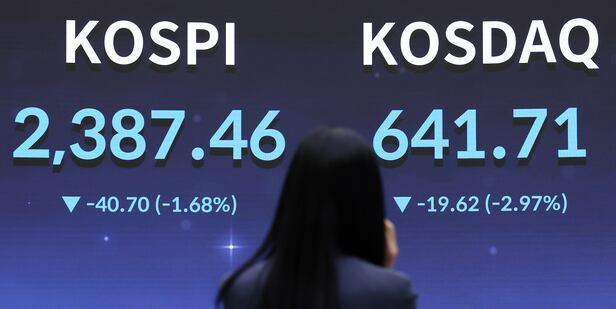 코스피지수는 이날 오전 11시 2분 2384.37을 기록했다. 전 거래일보다 43.79포인트(1.8%) 내렸다. 장 중 2374.07까지 밀리면서 2023년 11월 이후 최저점을 새로 썼다.