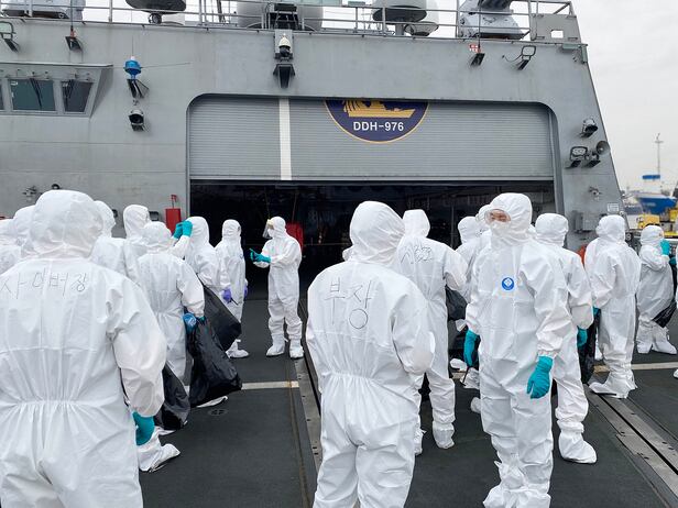 신종 코로나 바이러스 감염증(코로나19) 집단 감염이 발생한 청해부대 34진 문무대왕함(4400톤급) 승조원 전원이 19일 오후(한국시각) 아프리카 현지에서 군 수송기를 타고 귀국길에 올랐다. 이들은 20일 오후 한국에 도착한다.