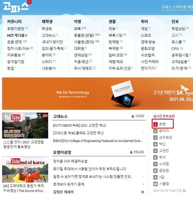 24일 고려대에 따르면 이날 오전 기준 고려대 커뮤니티 '고파스' 검색어 순위 1위는 '조민'이다. 부산대가 조씨 입학 취소를 결정하면서 고려대를 졸업한 조씨 입학도 취소하라는 글이 쇄도했기 때문으로 보인다.