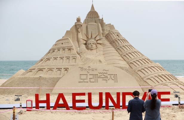27일 부산 해운대구와 경찰 등에 따르면 지난달 23일 오후 9시쯤 40대 A씨 등 남성 2명이 해운대해수욕장에서 모래 축제를 위해 작업 중인 모래조각 작품에 올라가 작품을 훼손했다.