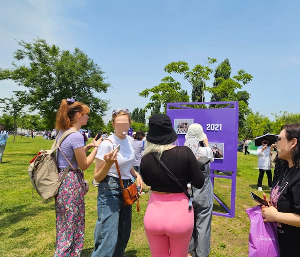 한강공원에 설치된 'BTS Presents Everywhere(BTS는 어디에나 존재한다)'는 보라색 글씨 조형물 앞에서 친구 3명과 함께 줄 서고 있던 영국인 새미 리버스(21) 씨는 직장에 3개월간 휴가를 내고 BTS 10주년을 기념하기 위해 한국에 왔다. 그는 지난달부터 친구들과 함께 부산과 제주를 여행했다며 "2017년도부터 BTS의 팬이 됐고, 한국을 그간 너무 여행하고 싶었는데 꿈을 이뤘다"면서 "저녁에 하는 불꽃놀이도 기대된다. 10주년을 축하할 수 있어 벅찬 기분"이라고 말했다.