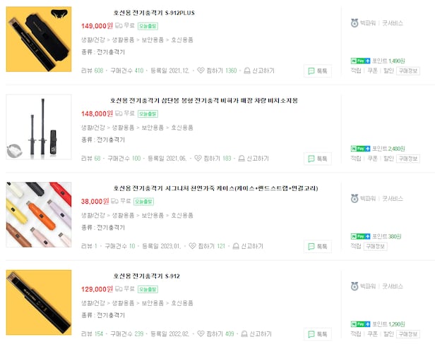 19일 온라인 판매 플랫폼 G마켓에 따르면, 올해 4~6월 현관 잠금장치, 문에 설치하는 경보기, CCTV 등 방범용품 매출은 전년 대비 48% 늘었고 삼단봉, 경보기, 가스총 최루 스프레이 등 호신용품 매출은 12% 증가했다. 네이버 쇼핑에선 전기충격기 검색량이 5월 7~13일 2110회에서 6월 7~13일 5420회로 2배 이상 증가했다.