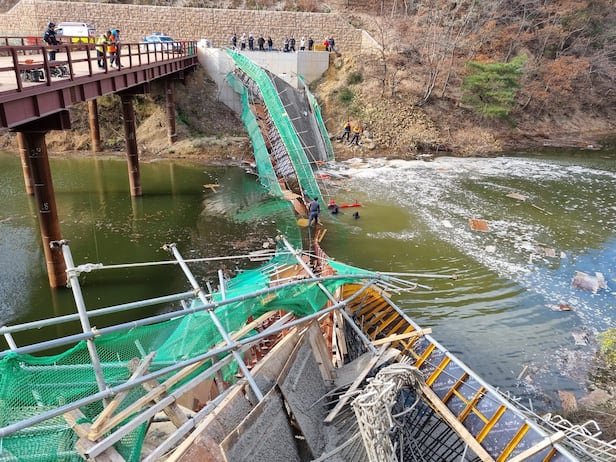 고용부에 따르면 27일 오전 11시쯤 안계댐 건설 현장에서 관리교 교량 상판이 붕괴되는 사고가 발생했다. 작업자 8명은 안계저수지 관리교 거푸집에 콘크리트를 타설하다가 상판이 무너져 약 7m 아래 저수지로 추락했다. 이 가운데 하청업체 소속 근로자 A(51)씨와 B(64)씨 등 2명은 숨진 채 발견됐다. 나머지 6명은 다리 골절 등 중경상을 입은 채 자력으로 나오거나 타인 도움으로 구조돼 병원으로 이송됐다.