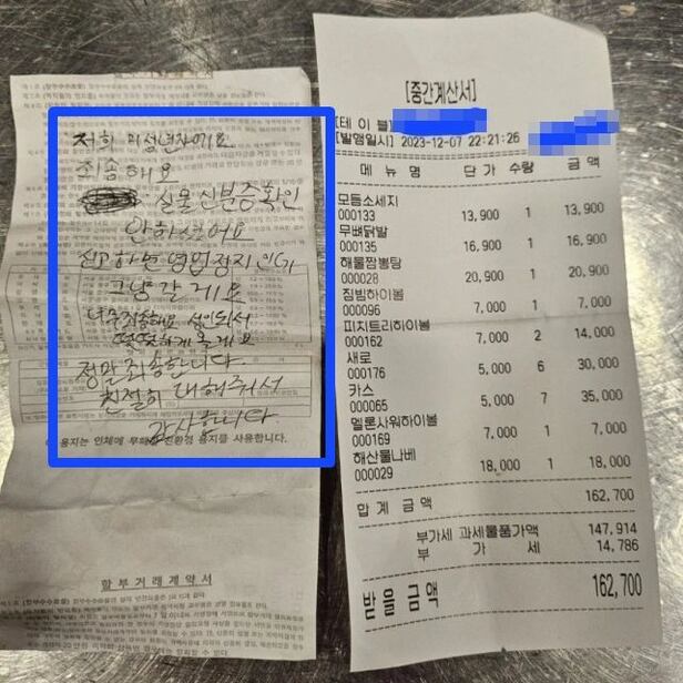 술집에서 16만 원어치 음식을 먹은 고등학생들이 '신분증 확인 안 하면 영업 정지인데 그냥 갈게요'라고 쪽지를 남기고 도망갔다는 사연이 전해졌다.