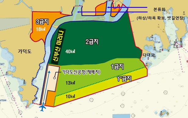 첫째 동서방향으로 계획된 활주로를 남북방향 방조제 위에 건설해야 한다.