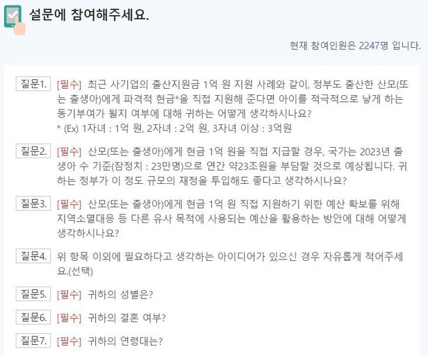 설문 문항은 총 4개다. 정부가 출산한 산모 또는 출생아에게 1자녀당 1억원 등 현금을 파격적으로 지원하면 아이를 낳을 동기 부여가 될지 의견을 묻고, 정부가 이 정도의 재정을 투입해도 좋다고 생각하는지 묻는다.