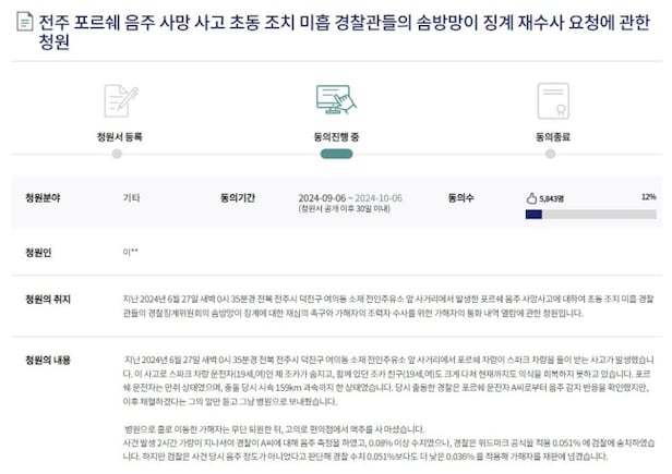 전북 전주에서 발생한 고급 스포츠카의 음주 사망사고 당시 미흡한 초동 조치에도 경징계를 받은 경찰관에 대한 재심의를 촉구하는 국민청원이 올라왔다. 징계 수위가 너무 낮다는 게 청원 취지다.